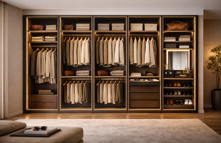 Armadi a filo parete su misura, dove materiali selezionati, interni personalizzabili e dettagli raffinati si integrano nelle superfici in legno, creando soluzioni di contenimento eleganti e senza tempo.