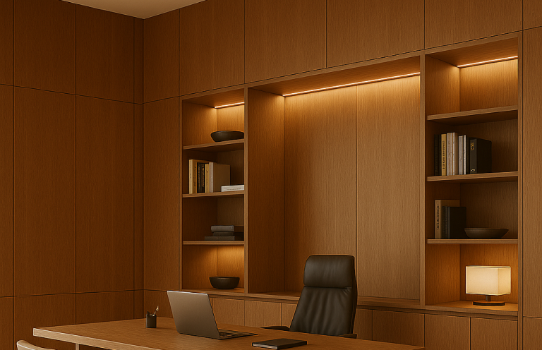 Il sistema Voluta consente di integrare soluzioni di illuminazione direttamente nelle pareti e nelle boiserie, trasformando la luce in parte attiva dell’architettura.