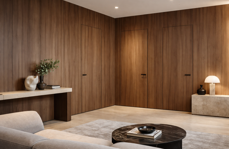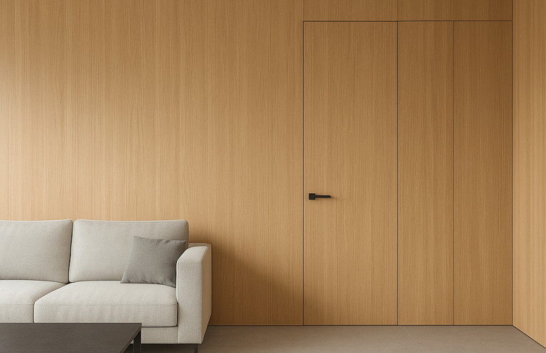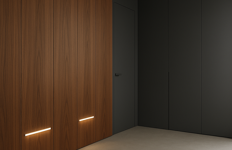 Porte filo-parete progettate su misura, integrabili nelle superfici in legno, personalizzabili nelle finiture e configurabili per garantire continuità visiva, precisione tecnica ed eleganza architettonica.