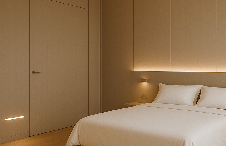 Pareti a tutta altezza, armadi integrati, porte filo-parete, impianti e prese elettriche a scomparsa diventano parte di un unico sistema coerente e funzionale.