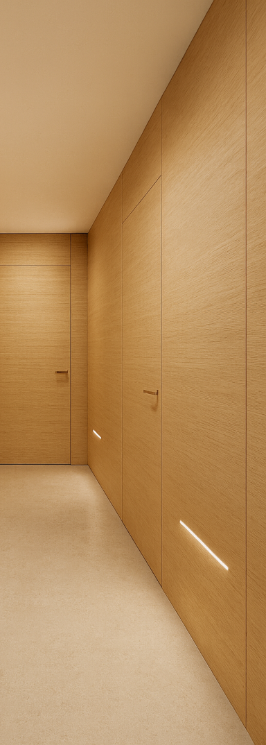 Soluzioni filo-parete coordinate a pareti e armadi, pensate per eliminare ogni discontinuità visiva e trasformare il passaggio in un gesto architettonico discreto.